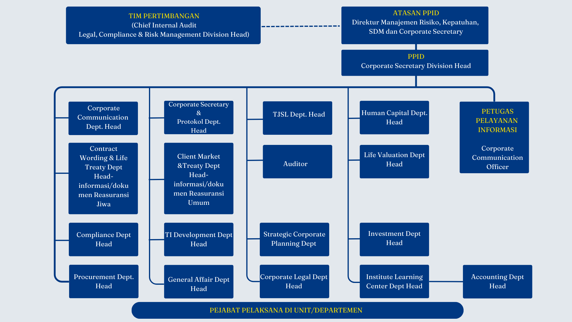 Ditunjuk sebagai Pejabat Pengelola Informasi dan Dokumentasi (PPID) PT Reasuransi Indonesia Utama (Persero) melalui Keputusan Direksi No. 00041/HK.04.02/00/IndonesiaRe/08/2023 tentang Pembentukan dan Penunjukan Pejabat Pengelola Informasi dan Dokumentasi (PPID) PT Reasuransi Indonesia Utama (Persero).
